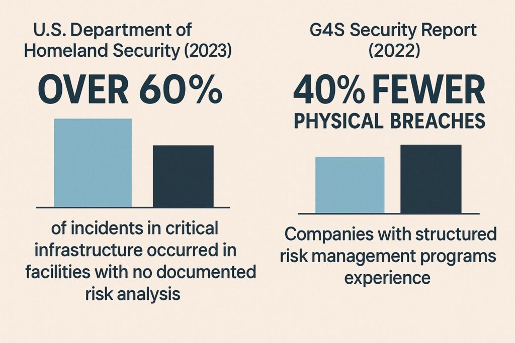 Organizations that skip formal risk assessment often fall into the same trap: they prepare for yesterday’s threats instead of tomorrow’s. The U.S. Department of Homeland Security (2023) found that over 60% of incidents in critical infrastructure occurred in facilities with no documented risk analysis. Similarly, a G4S Security report (2022) revealed that companies with structured risk management programs experience 40% fewer physical breaches.