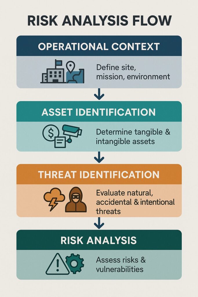 The process of analyzing risk begins with a clear understanding of what is being protected. Analysts start by defining the operational context: the site, the mission, and the surrounding environment. A power plant in a politically unstable region faces a different risk spectrum than a private academy or a logistics hub.